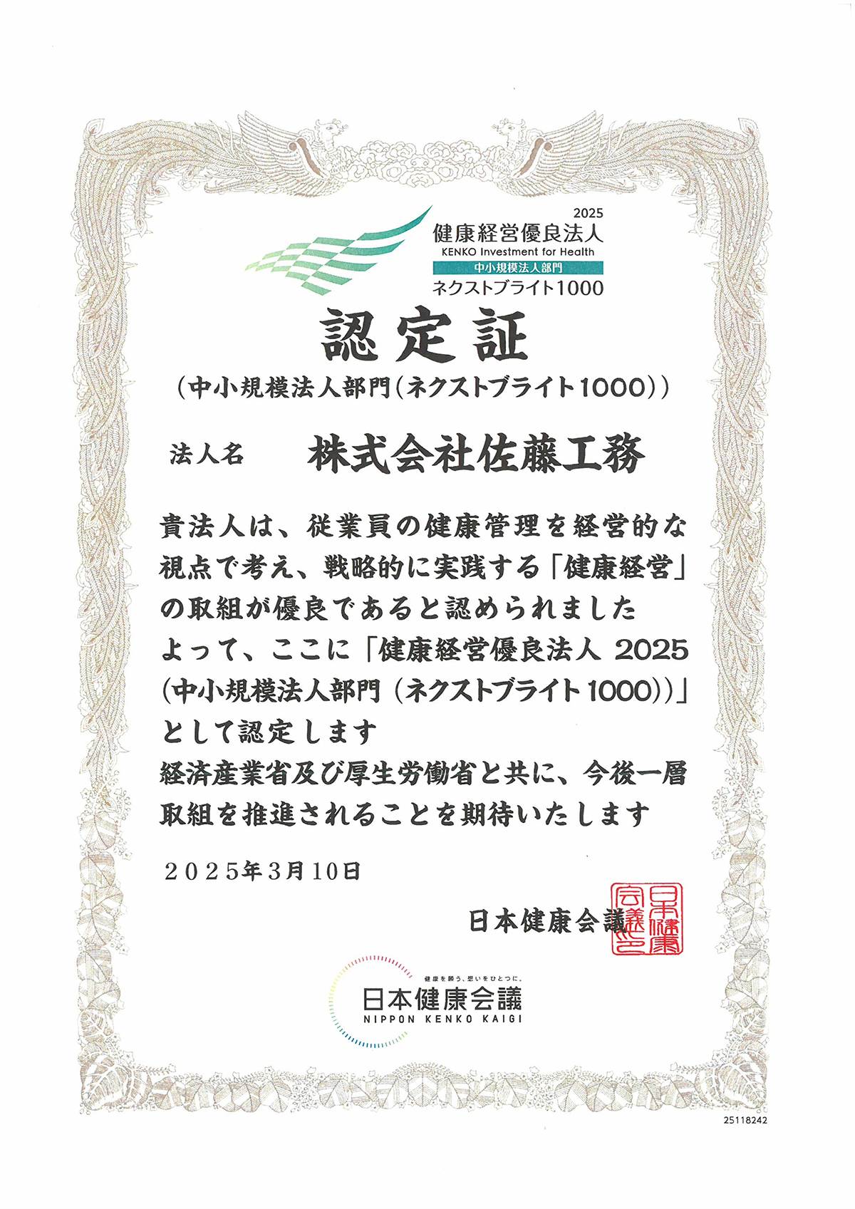 株式会社佐藤工務は、健康経営優良法人2025(中小規模法人部門ネクストブライト1000)に認定されました。
